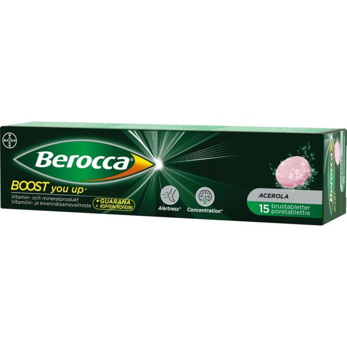 Den skräddarsydda sammansättningen bidrar, genom vitamin B2, B3, B5, B12, C och magnesium, till att minska trötthet och utmattning. Berocca Boost innehåller även koffein (från bl. a. guarana). Koffein ökar uppmärksamhet och förbättrar koncentrationen. KOSTTILLSKOTT. Innehåller koffein (75 mg koffein/brustablett). Ett totalt koffeinintag på 400 mg koffein/dag från alla källor bör inte överskridas. Rekommenderas inte för barn, gravida, ammande eller koffeinkänsliga personer. Kosttillskott ska inte användas som ersättning för en varierad kost och hälsosam livsstil. Bayer Oy