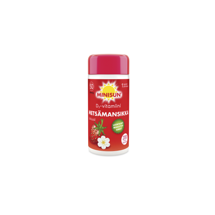 Suomessa kehitetyt Minisun D-vitamiinitabletit ovat helppo tapa varmistaa riittävä D-vitamiinin saanti ympäri vuoden. Minisun 50 mikrog Metsämansikka sisältää tehokkaasti imeytyvää D3-vitamiinia. D-vitamiini vahvistaa vastustuskykyä sekä on tärkeä vitamiini luuston, lihasten ja hampaiden hyvinvoinnille. Annostelu on helppoa. Yksi pieni purutabletti päivässä riittää. Minisun 50 mikrog Metsämansikka on raikkaan kesäisen makuinen ja se sopii nuorille, aikuisille ja ikääntyville tehostettuun päivittäiseen käyttöön. Minisun Metsämansikka on helppo pureskella, imeskellä tai niellä. Laktoositon, gluteeniton, hiivaton, soijaton ja liivatteeton.