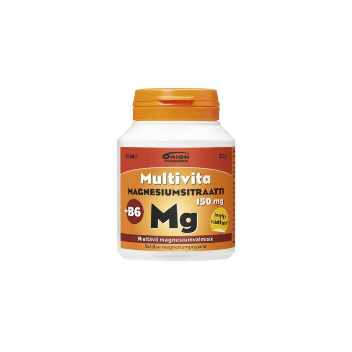 Multivita Magnesiumsitraatti on sisältää 150 mg magnesiumia tehokkaasti imeytyvässä sitraatimuodossa, sekä 2 mg magnesiumin imeytymistä tehostavaa B6-vitamiinia. Helposti nieltävä, puolitettava tabletti. Laktoositon (maidoton), gluteeniton, sokeriton ja hiivaton. Ei sisällä eläinperäisiä aineosia, sopii myös vegaaneille. Ravintolisä.